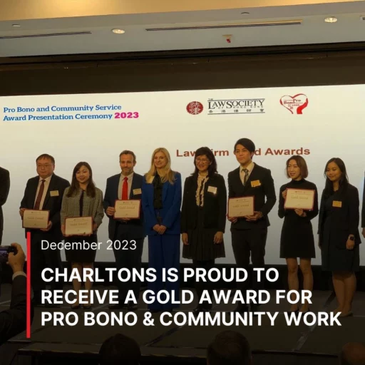 On 13 December 2023, partners of Charltons Julia Charlton and Clinton Morrow were honoured to receive on behalf of Charltons the Hong Kong Law Society’s Gold Award – Pro Bono and Community Work Recognition Programme 2023 from The Law Society of Hong Kong for the period from 1 July 2022 to 30 June 2023, this award recognises law firms with outstanding contributions in providing pro bono services in Hong Kong or abroad. Charltons provides pro bono legal services to charities and NGOs.