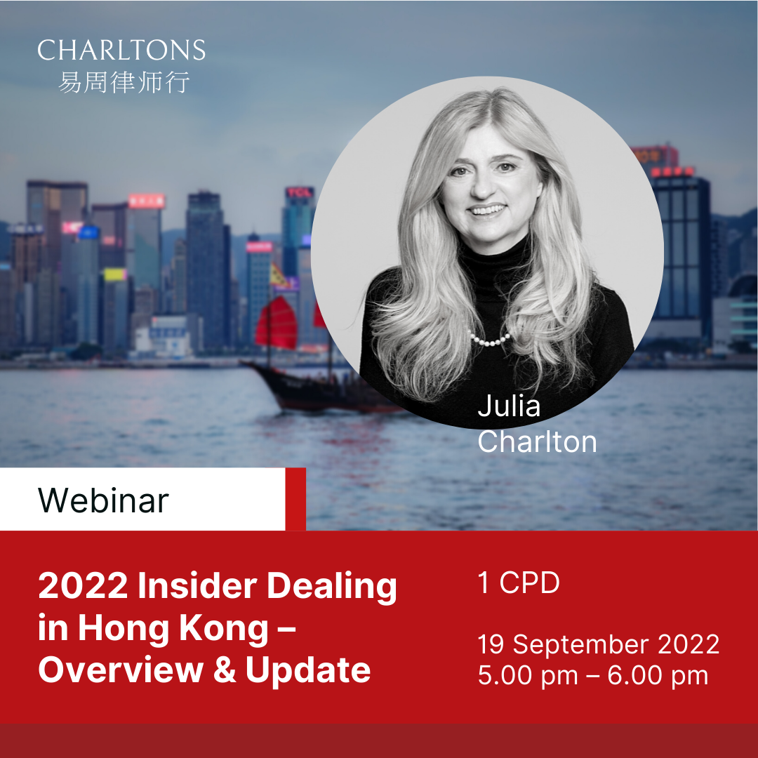 Webinar presented by Julia Charlton: 2022 Insider Dealing in Hong Kong – Overview & Update. Now available on the Charltons YouTube-channel.