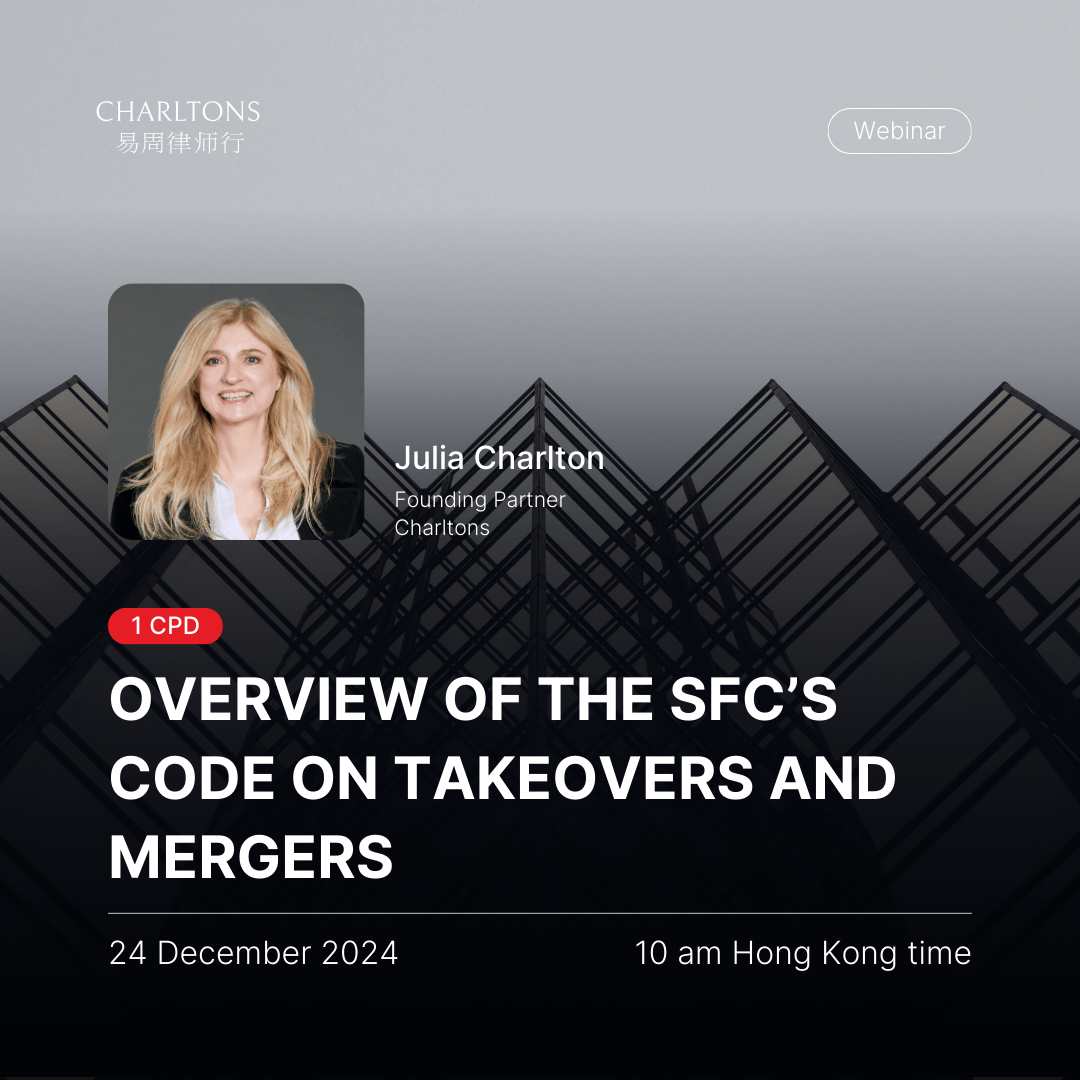 Julia Charlton presented a webinar on the Overview of the SFC’s Code on Takeovers and Mergers.